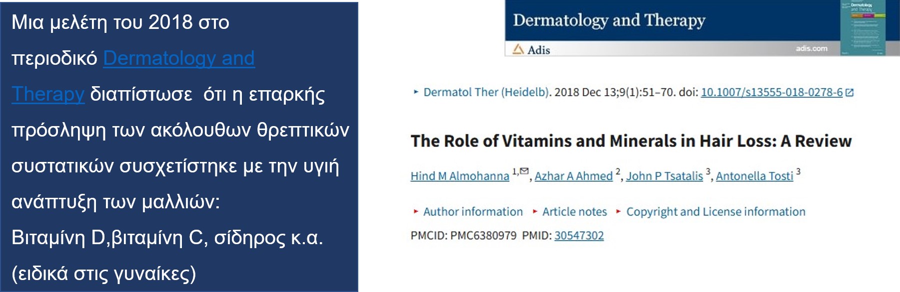 Μια μελέτη του 2018 στο περιοδικό Dermatology and Therapy διαπίστωσε επίσης ότι η επαρκής πρόσληψη των ακόλουθων θρεπτικών συστατικών συσχετίστηκε με την υγιή ανάπτυξη των μαλλιών: βιταμίνη D,βιταμίνη C, σίδηρος (ειδικά στις γυναίκες)