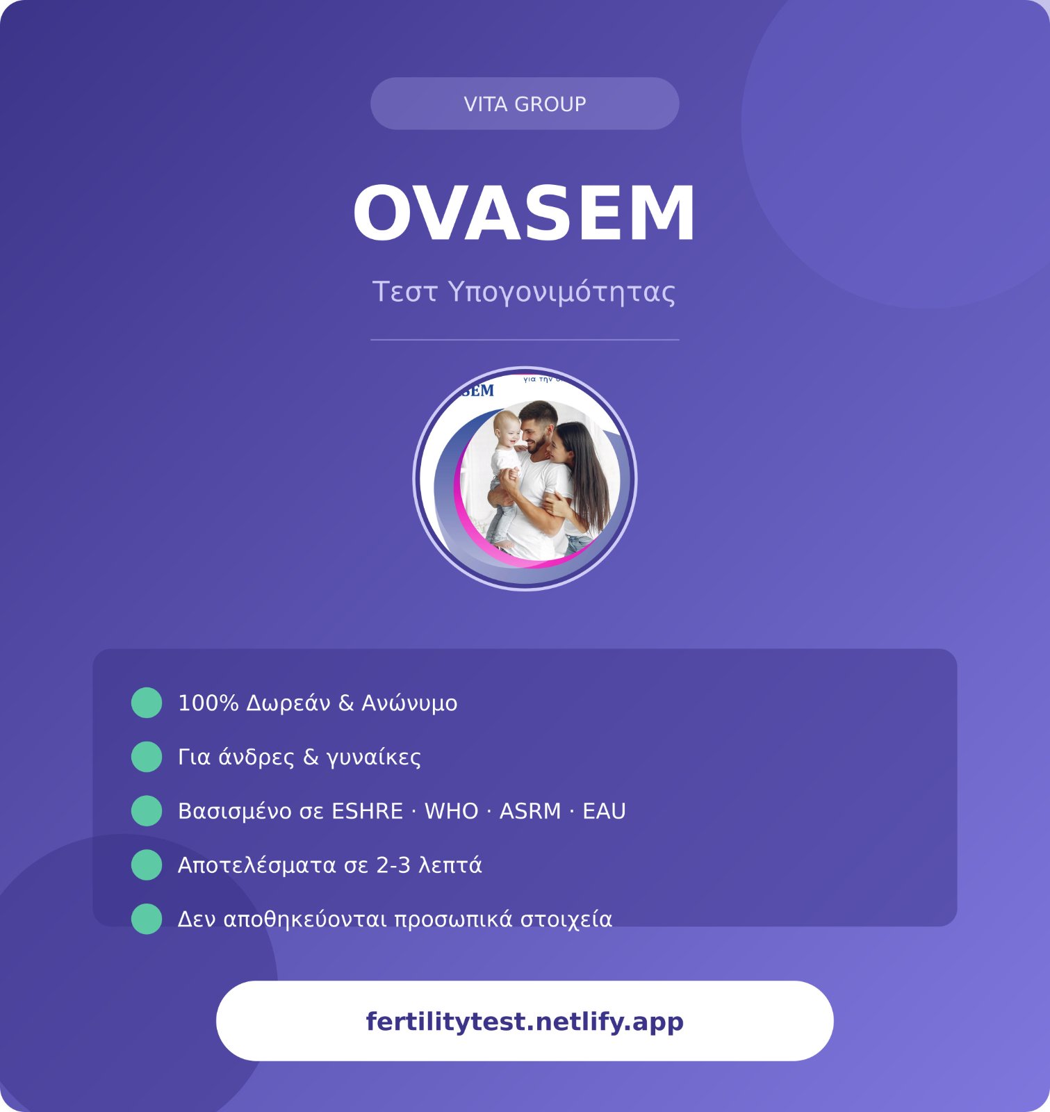 Fertility Test: To πρώτο Ελληνικό AI Τεστ Υπογονιμότητας Ο όμιλος VitaGroup® λανσάρει το Fertility Test την πρώτη ελληνική εφαρμογή εξατομικευμένης αξιολόγησης γονιμότητας με τεχνητή νοημοσύνη, σε πλήρη συμμόρφωση με τον Κανονισμό ΕΕ 2024/1689 (EU AI Act).